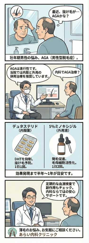AGAはDHTという男性ホルモンが原因で生じる脱毛症です。壮年期の男性にみられる薄毛の原因として最も多くみられます。